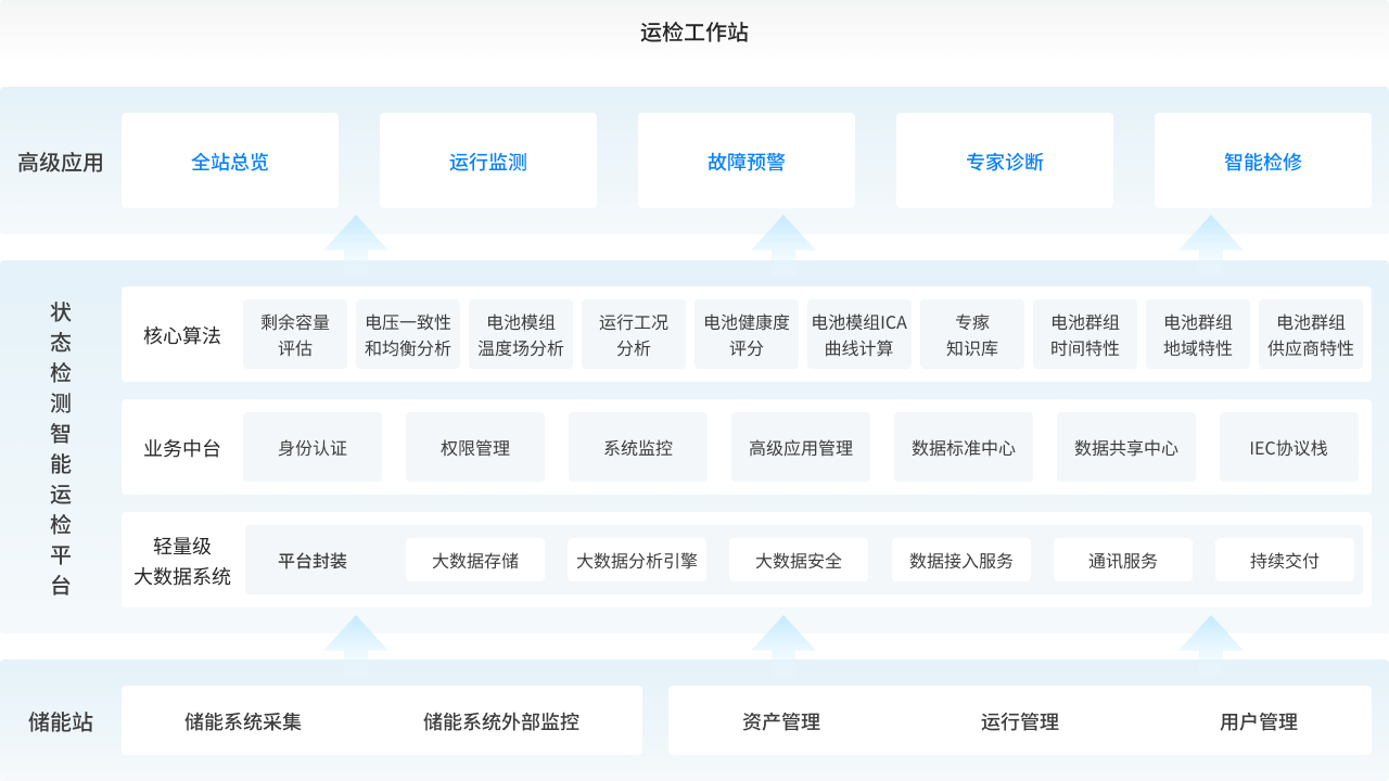 儲能電站安全運行風險監測及預警系統以平臺層加高級應用層的總體架構實 現,通過數據管理平臺實現對物聯網層儲能系統的 數據采集,實現全站概覽、 運行監測、故障主動安全預警、故障專家診斷以及 智能檢修管理等高級應用。